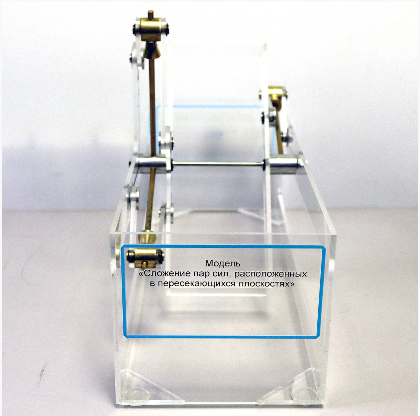 Модель предназначена для демонстрации принципов сложения моментов пар сил, действующих в пересекающихся плоскостях. Используется в качестве наглядного пособия при изучении раздела «Статика» в курсах теоретической механики и инженерной механики в университетах и колледжах.