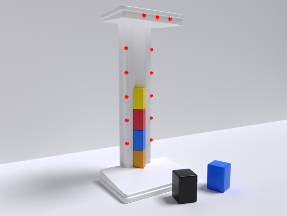 Ребёнку необходимо по очереди помещать кубики в желоб, пока он не заполнится до конца. В момент, когда кубик оказывается на своём месте, загораются 2 огонька; при помещении последующих кубиков продолжают загораться новые лампочки. Как только последний из кубиков окажется внутри желоба – загорятся остальные огоньки и заиграет музыка.