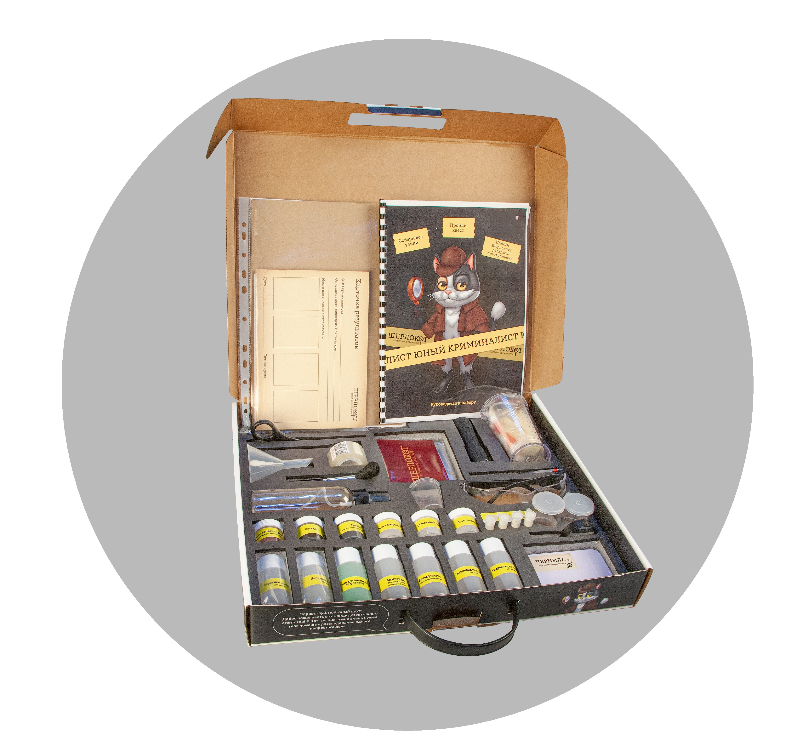 Чемоданчик — криминалиста -это целая лаборатория! В него входит книга с подробными инструкциями и все необходимые для проведения опытов компоненты.