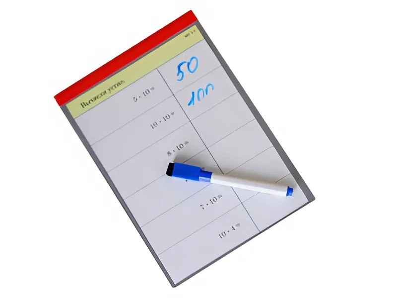 Планшет размером 150*210 мм изготовлен из пластика. На лицевой стороне планшета закреплена пленка, под которую может помещаться карточка с заданиями. Ответы записываются на пленке маркером на водной основе. Надписи можно стирать специальным ластиком, закрепленным в колпачке. Планшеты можно использовать с карточками, подготовленными самостоятельно. Размещение на оборотной стороне карточки заданий с ответами дает возможность учащимся самостоятельно проверить правильность решения, оценить свою работу и исправить ошибки. Кроме того, можно предложить учащимся самостоятельно составить задания.