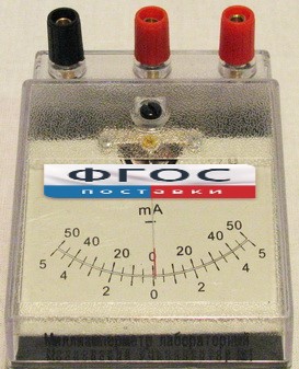 Прибор состоит из магнитоэлектрического измерительного механизма и шкалы, установленных в специальном корпусе с приборным гнездом. Отсчетное устройство представляет собой шкалу с механическим (стрелочным) указателем. Шкала равномерная, с нулевой отметкой посередине и двойной оцифровкой. Миллиамперметр имеет пределы от -5 до +5mА и от -50 до +50mА , цена деления составляет 0,5mА и 5mА соответственно. Прибор имеет три входных комбинированных гнезда. Левое обозначено знаком «-» (клемма из пластмассы черного цвета), к нему подключается «минус» от источника тока. При включении необходимо соблюдать полярность (левое гнездо – отрицательное).