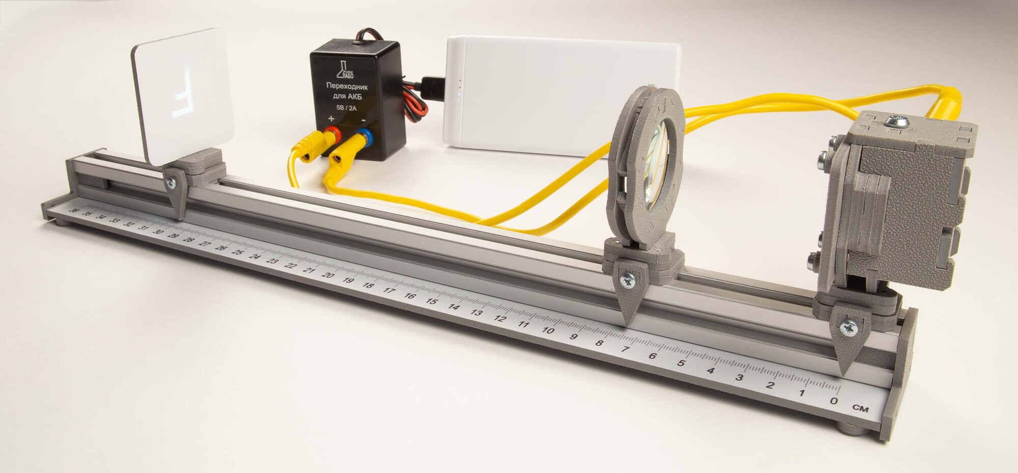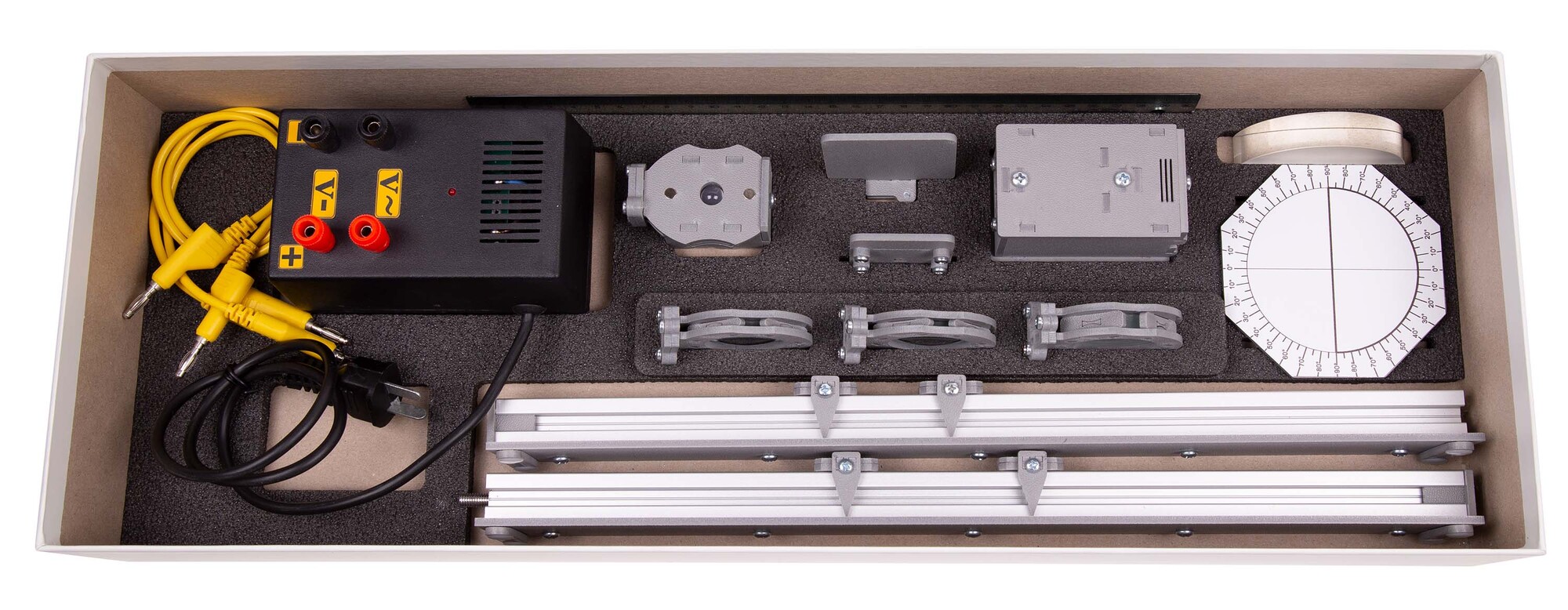 Комплект позволяет измерять оптическую силу собирающей линзы, фокусное расстояние и показатель преломления стекла, исследовать свойства изображения, полученного с помощью собирающей линзы, изменение фокусного расстояния двух сложенных линз, зависимость угла преломления от угла падения на границе воздух-стекло и проводить др. опыты.
