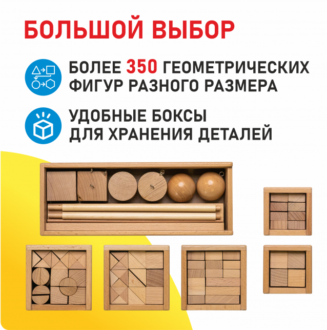 Модуль № 13 (5B), состоящий из 44 элементов разной формы (кубики, призмы, цилиндры и др.), учит ребенка создавать сложные сборные сооружения и конструкции (Башенки)