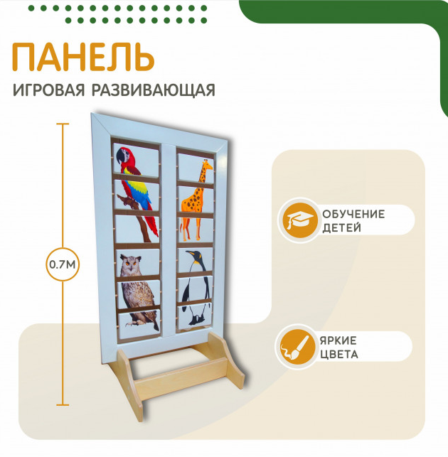 Напольная развивающая панель о мире животных №2 изготовлена из натурального дерева с трехступенчатым шлифованием и безопасным покрытием красками и лаком. Панель состоит из двухсторонних секций, в каждой из которых размещены вращающиеся таблички с изображениями частей животных и птиц. Принцип действия - ребенок, вращая таблички по очереди, составляет изображения животных и птиц методом подбора. Такая игра помогает развивать оба полушария мозга одновременно, задействуется логическое и критическое мышление.