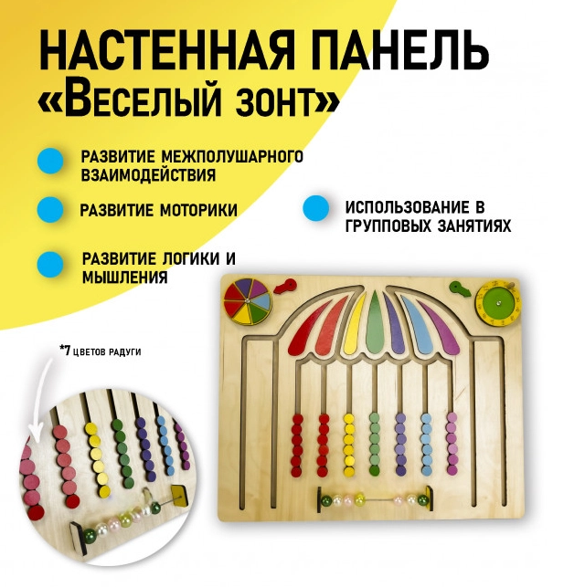 Настенная панель с тактильным лабиринтом в виде зонта — это необычный детский игровой модуль, отличающийся оригинальным исполнением. С его помощью можно занять ребёнка и сделать это с пользой для его развития. А ещё настенная панель легко и безопасно крепится к стене, что позволяет разместить её в небольшом помещении благодаря компактному исполнению и выгодно отличает от объёмных аналогов. Поверхность обработана специальным образом и имеет многослойное покрытие из экологически безопасных материалов.