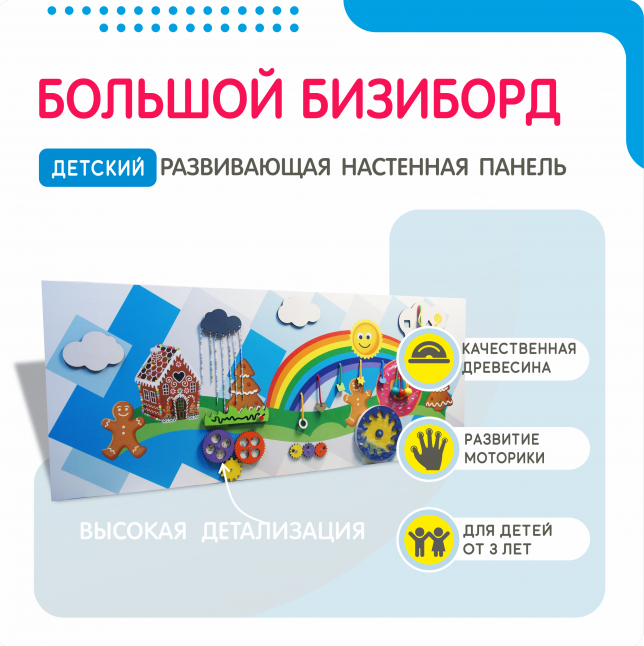 Настенная панель на тему веселых приключений - сказочная настенная игровая панель для весёлого времяпрепровождения малышей. Основание представленной модели имеет сложную многоугольную форму, выполнено в бело-голубой гамме, а игровые элементы выделяются на нём яркими акцентами.