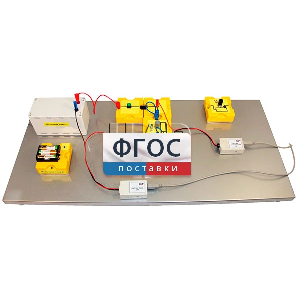 Лабораторная установка состоит из настольного металлического стенда, на котором собирается изучаемая электрическая цепь, датчика напряжения, датчика тока, двух источников постоянного тока и элементов электрической цепи. Элементы электрической цепи смонтированы в специальных боксах, на лицевой стороне которых находится обозначение элемента. Соединение цепи нагрузки с источником постоянного тока осуществляется на короткое время при включении кнопочного выключателя. Регистрация данных осуществляется с помощью датчика напряжения, который фиксирует напряжение на сопротивлении нагрузки, и датчика тока, измеряющего силу тока в цепи.