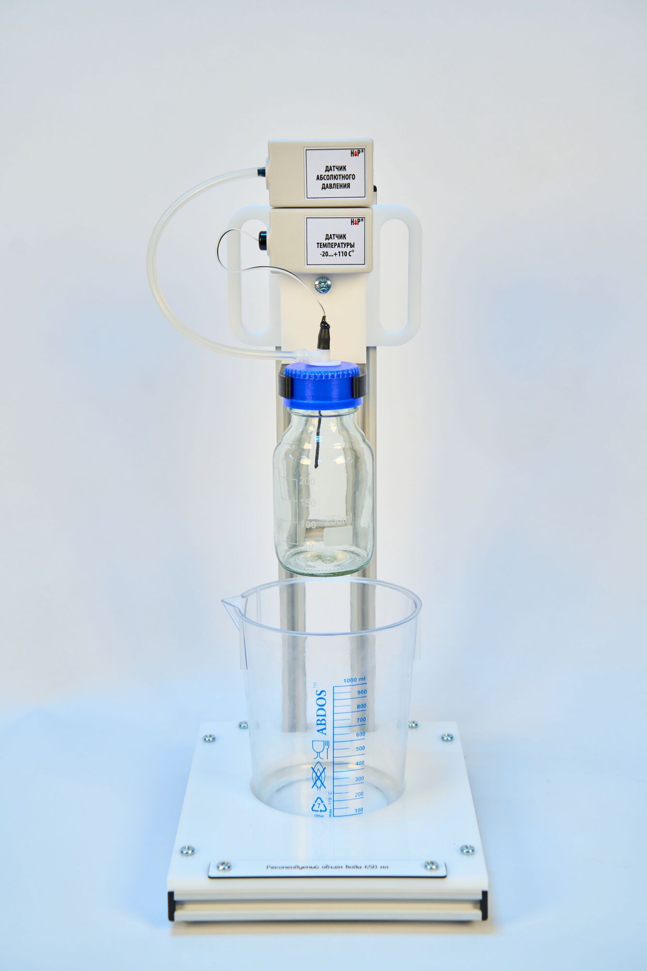 Лабораторная установка представляет собой герметичный стеклянный резервуар для газа, который смонтирован на вертикальной стойке таким образом, чтобы он мог быть погружен в стакан с горячей водой. Давление в нем измеряется цифровым датчиком абсолютного давления, который устанавливается над резервуаром и соединяется с ним гибкой трубкой.