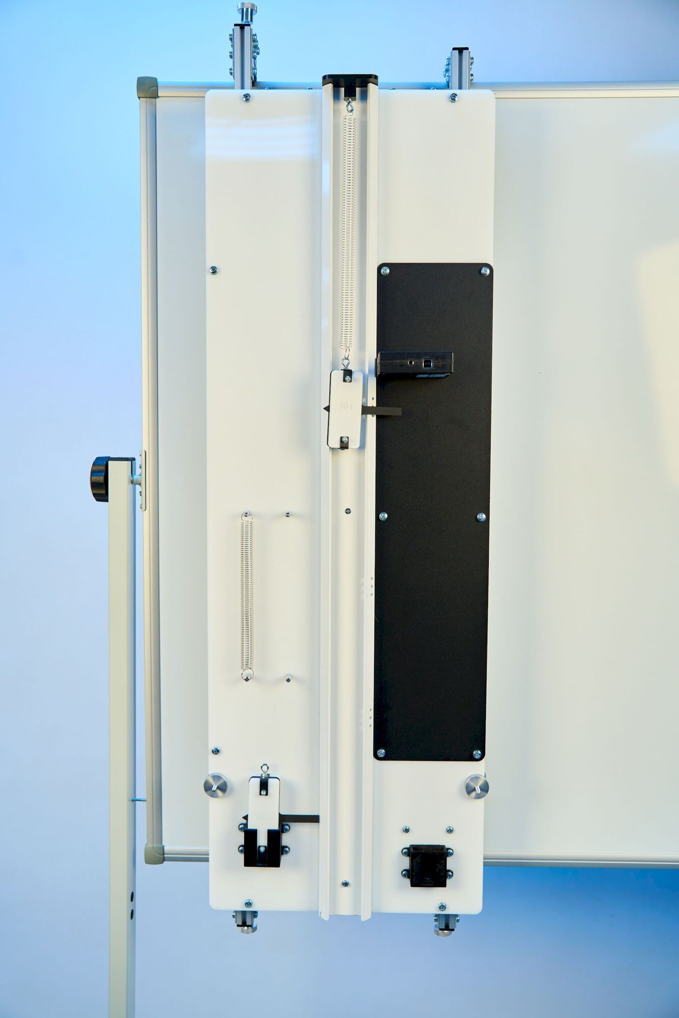 Колебательная система собрана на основе направляющей, расположенной вертикально. Пружина закрепляется в верхней части направляющей и растягивается подвижной кареткой. Конструкция каретки и направляющей обеспечивают скольжение каретки вдоль направляющей. На каретке имеются отверстия для фиксации дополнительного груза. Цифровой оптоэлектрический датчик, с помощью которого измеряется период колебаний системы, закреплен на вертикальном металлическом листе и может перемещаться вдоль его поверхности для установки вблизи положения равновесия каретки. Показания оптоэлектрического датчика выводятся на экран компьютера в виде диаграммы, показывающей изменение состояния датчика (открыт/перекрыт) от времени.