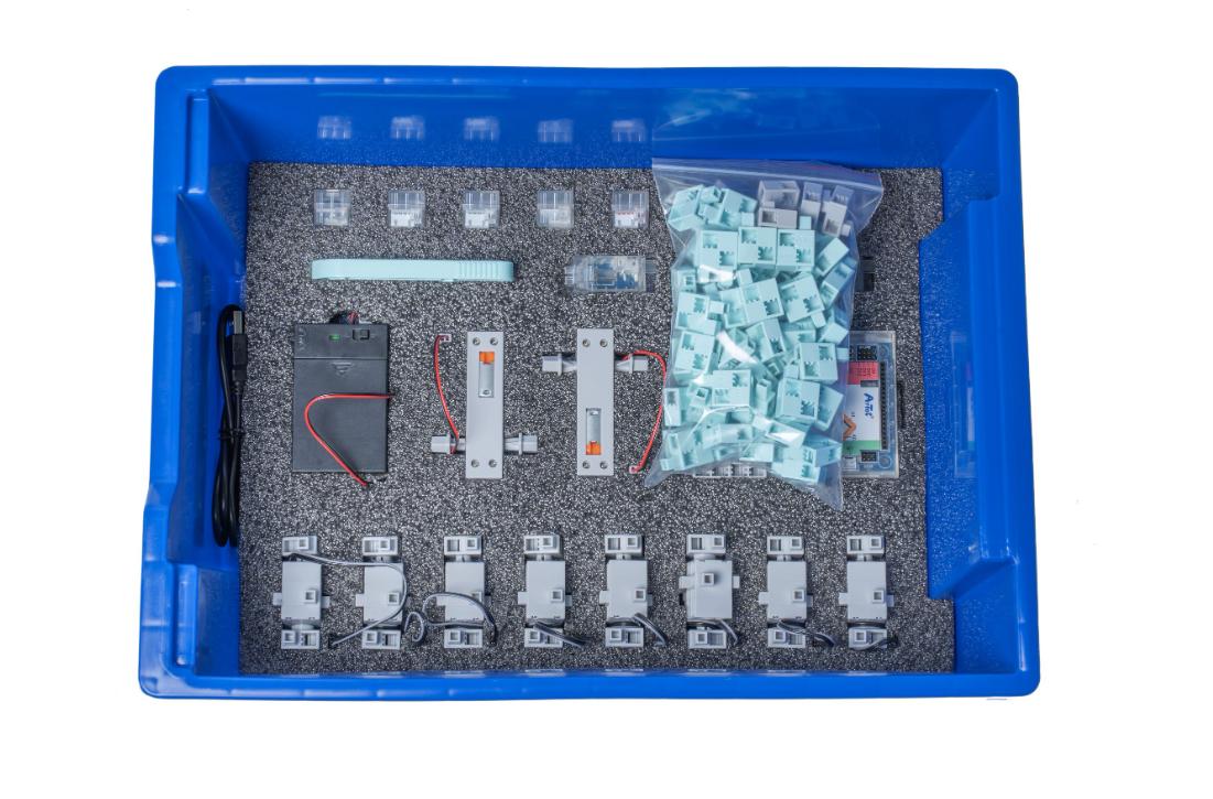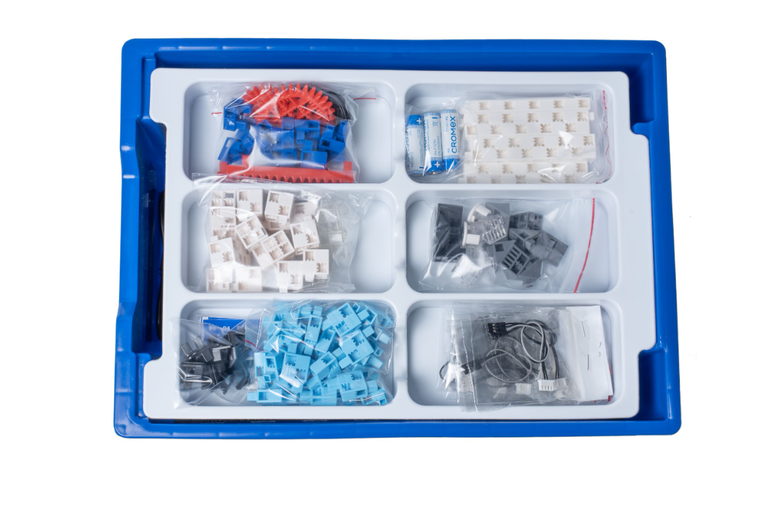 В наборе используется плата открытой архитектуры, датчики (датчик касания, инфракрасный датчик, датчик звука, датчик света) и исполнительные механизмы (моторы с редуктором, сервомоторы, зуммер, светодиоды). Все элементы выполнены в конструктиве единого стиля.