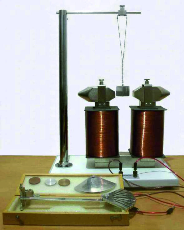 Установка позволяет демонстрировать опыты, которые подтверждают возникновения вихревых токов (токов Фуко) в металлических (не ферромагнитных) предметах, которые двигаются в магнитном поле.