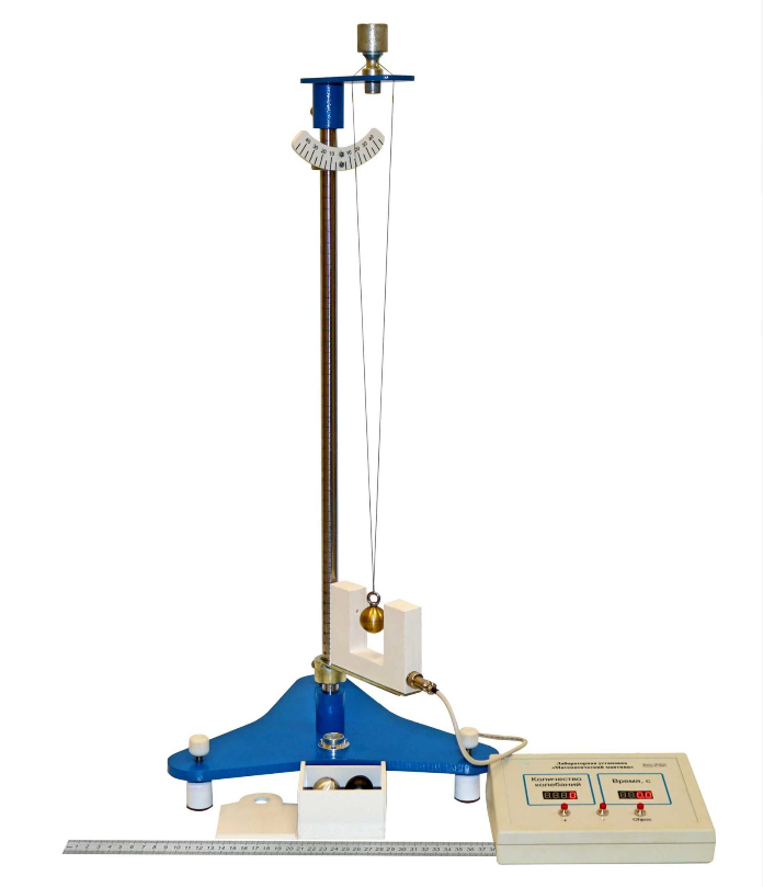 Установка представляет собой горизонтально расположенную опору, закрепленную на основании, в верхней части установки закреплена пластина, на которой зафиксирован нитевой держатель с возможностью изменять длину нити. На вертикальной опоре установлена каретка для перемещения оптического датчика. Для отсчета времени колебаний маятника используется электронный секундомер.
