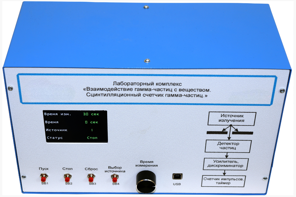 Стенд «Взаимодействие гамма-частиц с веществом. Сцинтилляционный счетчик гамма-частиц» содержит микропроцессорную систему с органами управления экспериментом и с выводом информации на графический ЖК дисплей.