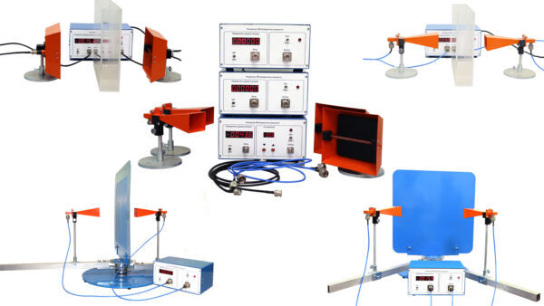 Лабораторный штатив №1 – 1 шт. (предназначен для установки образцов твердых материалов, приемной и передающей рупорных антенн. Представляет собой поворотное устройство с внешней и внутренними осями, способными вращаться независимо друг от друга, на которых установлены крепления для образцов исследуемых материалов и рупорной антенны. Для контроля угла поворота предусмотрены шкалы).